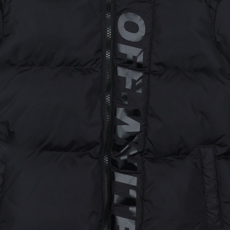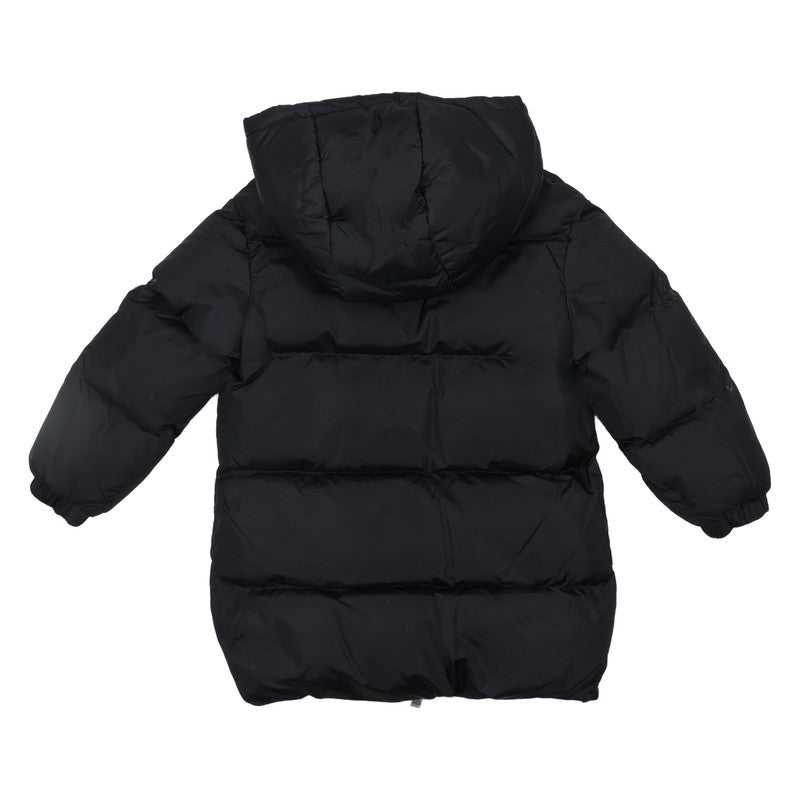 This cozy black puffer jacket features a warm hood with a soft pink lining. The full-length zipper is branded with a bold white logo, offering stylish warmth for colder days.