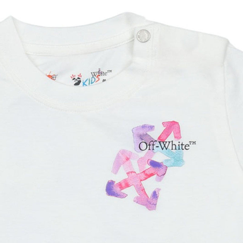 This soft white T-shirt for infants features convenient shoulder snaps and a colorful, watercolor-style Arrow logo graphic on the chest. A playful, artistic take on streetwear.