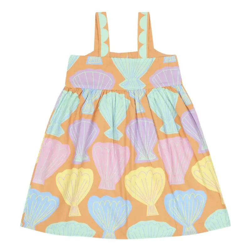 Orange dress for girls by Stella McCartney. Made from soft cotton with all-over colourful shell print pattern and scalloped trims on the front. Fastens with buttons on the front.