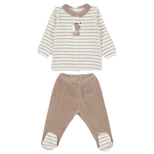 Two-piece footed baby outfit by iDO in chenille. The item features a back opening with snap buttons for easier dressing, with a striped pattern. The pants have an elastic waistband in a solid color.