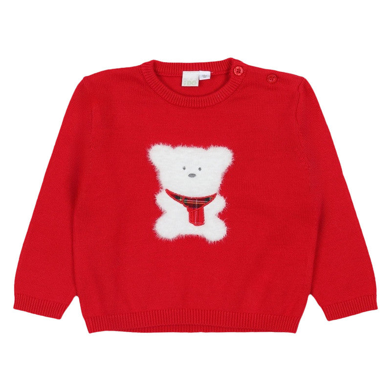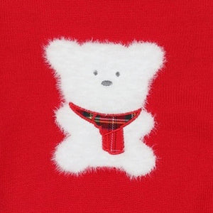 Get ready for the festive season with this adorable red knit sweater. It features a fluffy white polar bear appliqué wearing a plaid scarf, complete with shoulder snaps for easy dressing. Perfect for keeping warm and cheerful.