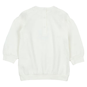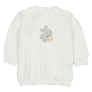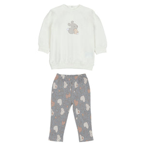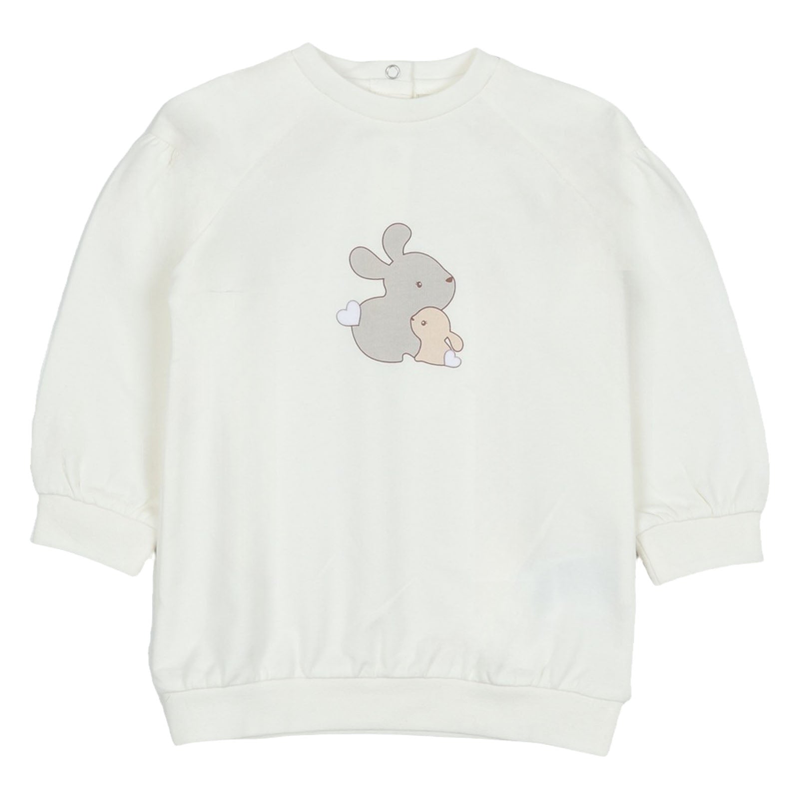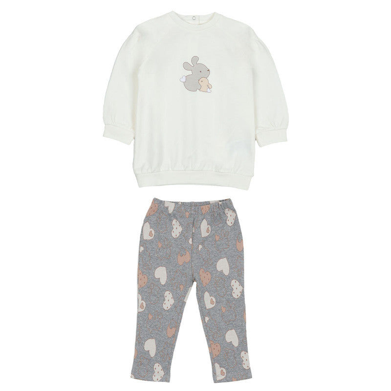 Outfit by iDO made of cotton. The oversized sweatshirt is made of winter cotton fleece, with back opening via snap buttons. The pants are in jacquard fabric with all-over pattern.