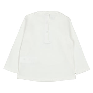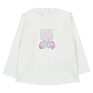 This soft, ivory long-sleeve top is detailed with an adorable bear graphic made of shimmering pink, purple, and blue rhinestones holding a heart. Perfect for adding a touch of sparkle and love to any outfit.