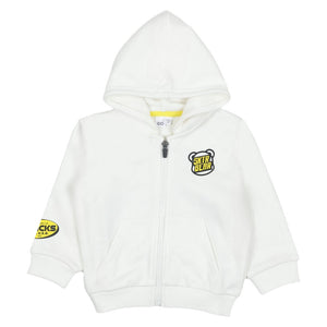 Keep them cozy and cool with this IDO white zip-up hoodie. Featuring a fun 'SKTR BEAR' graphic on the chest and contrasting yellow accent labels, this soft fleece jacket is perfect for everyday active wear.
