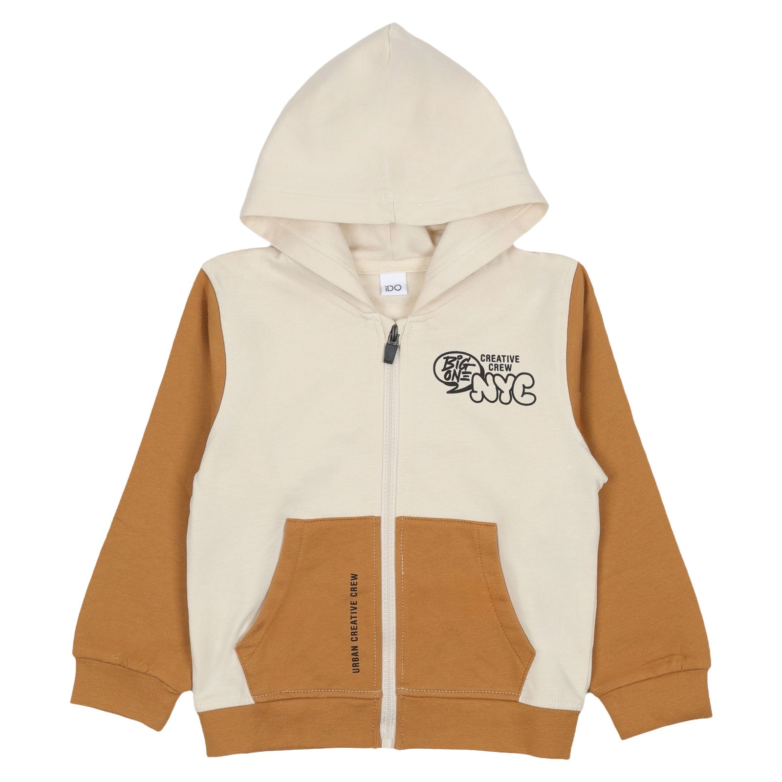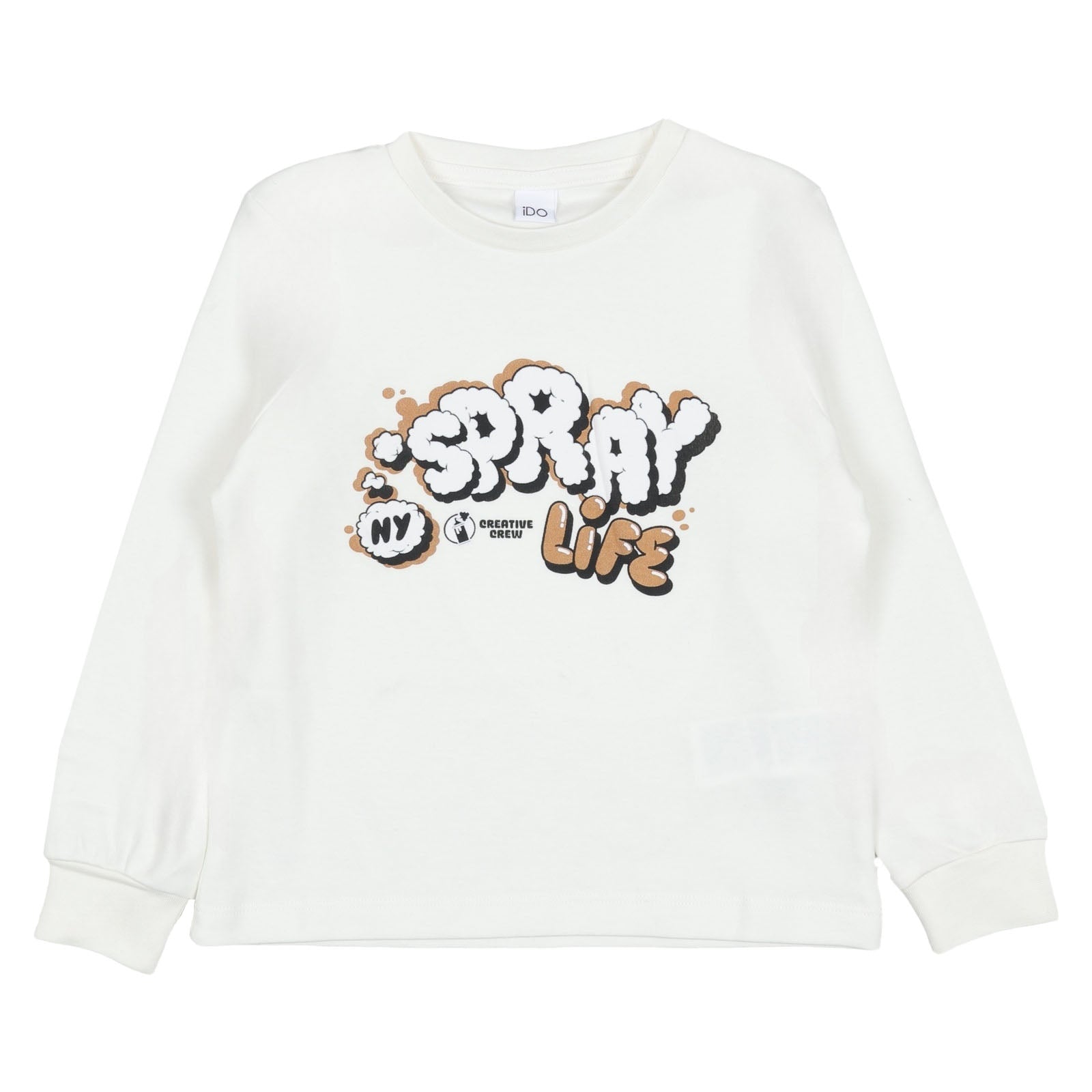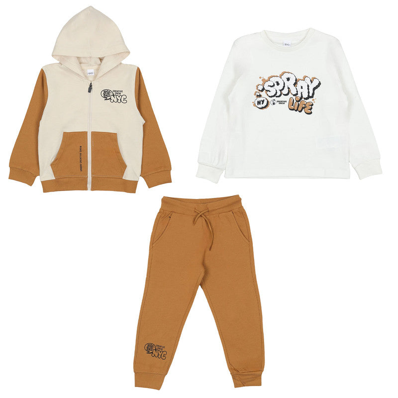 iDO composed of winter fleece tracksuit and t-shirt. Hooded zip-up sweatshirt with print. Pants with pockets, elasticated waist with drawstring. T-shirt in interlock with large print.