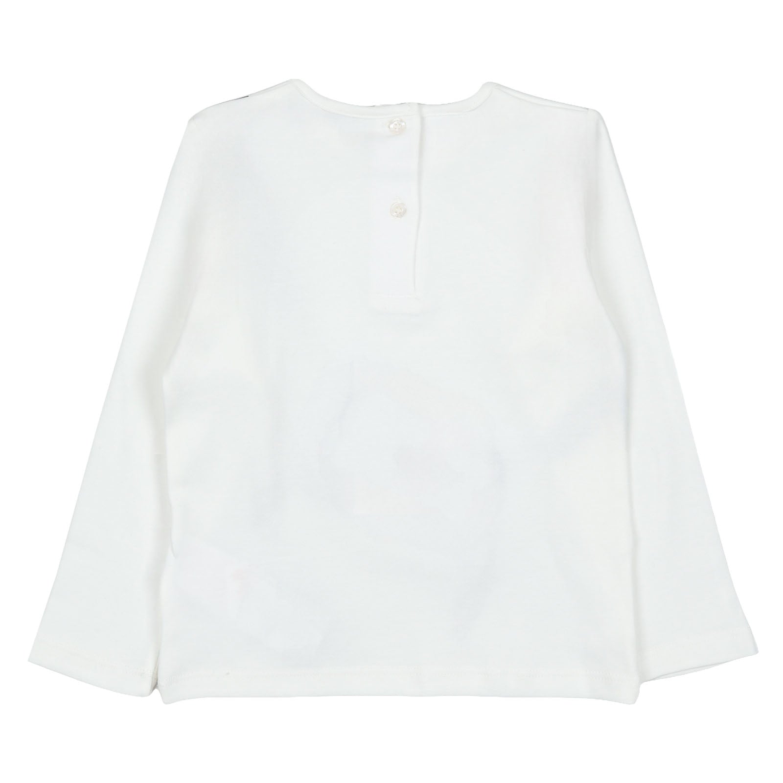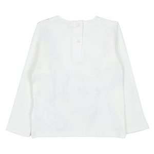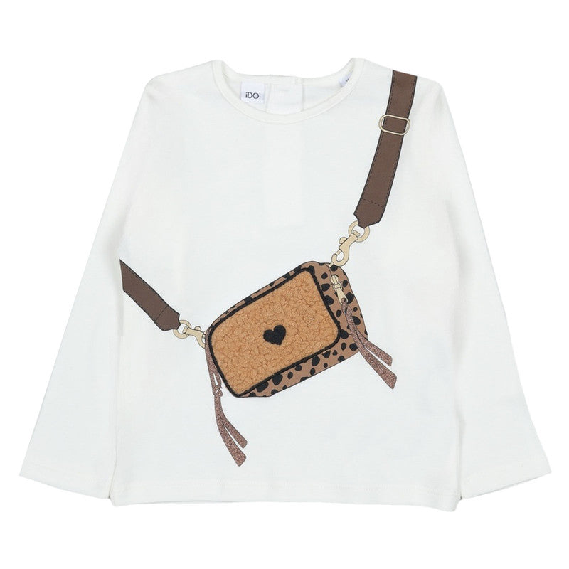 Off-white long-sleeved top by iDO, made in soft, comfortable cotton jersey. This casual top has a charming leopard print bag design on the front with glitter tassel detailing. It fastens with buttons on the back for ease of dressing.