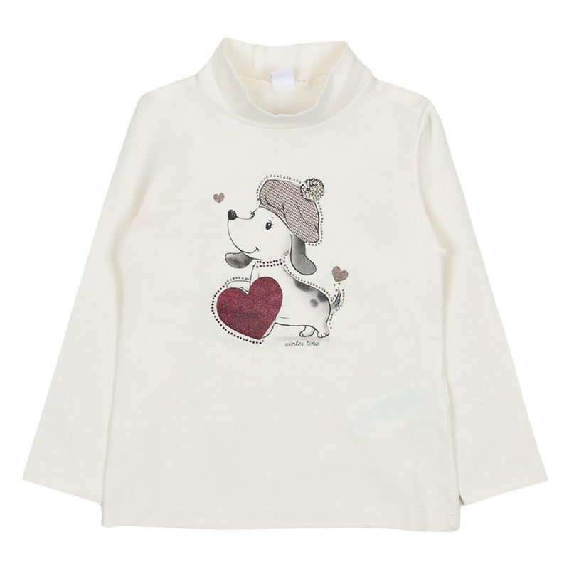 Stay cozy in this cute IDO high-neck top. It features a charming dog graphic wearing a beret, holding a sparkly heart, and is perfect for stylish warmth during 'Winter Time.'