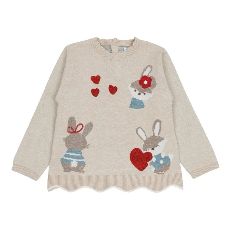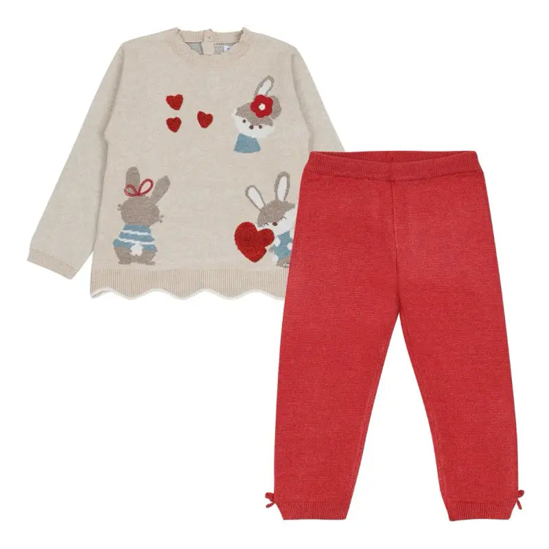 Cosy and warm, this beige and red leggings set by Mayoral is made from a soft viscose-blend knit. The long-sleeved jumper has adorable jacquard bunny rabbit designs on the front with red bouclé hearts for a sweet look.