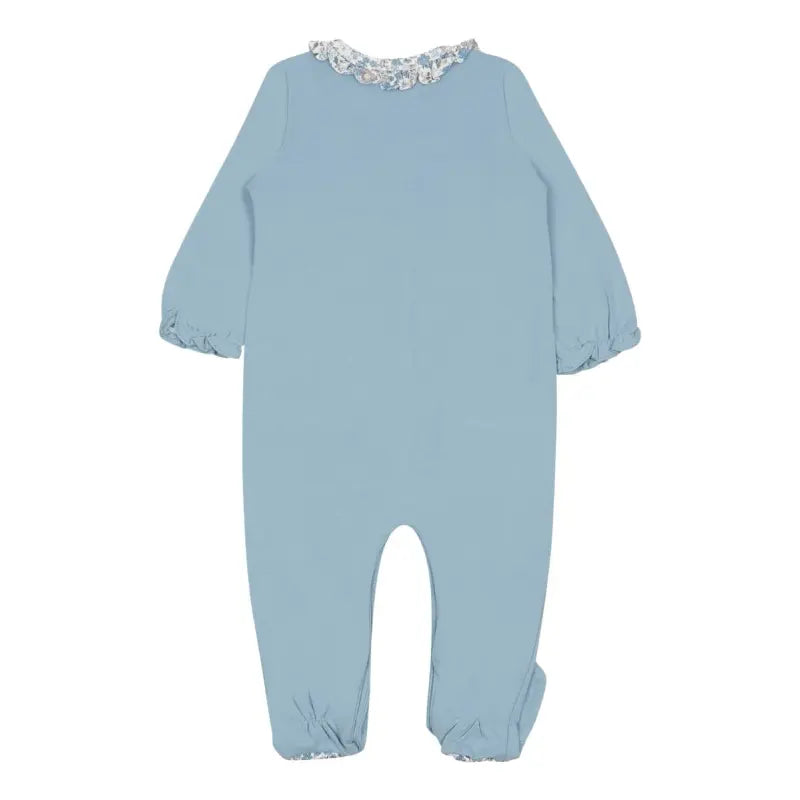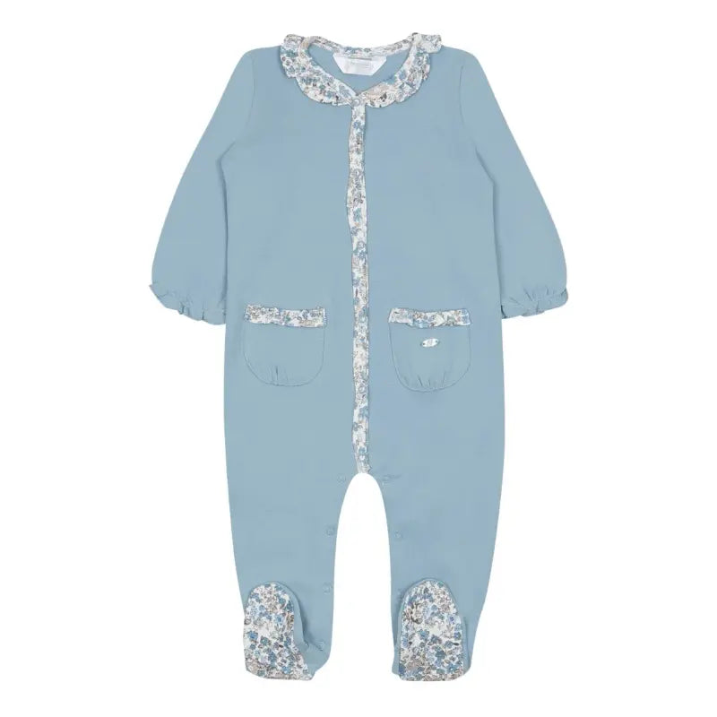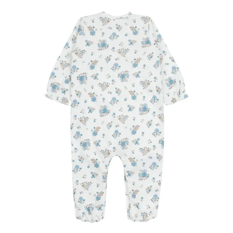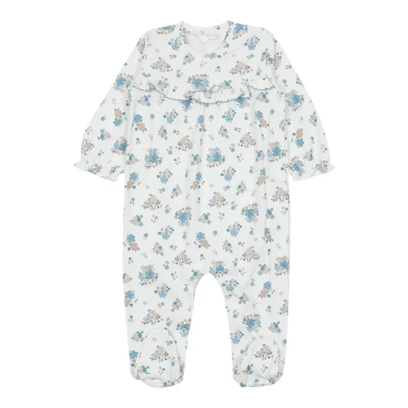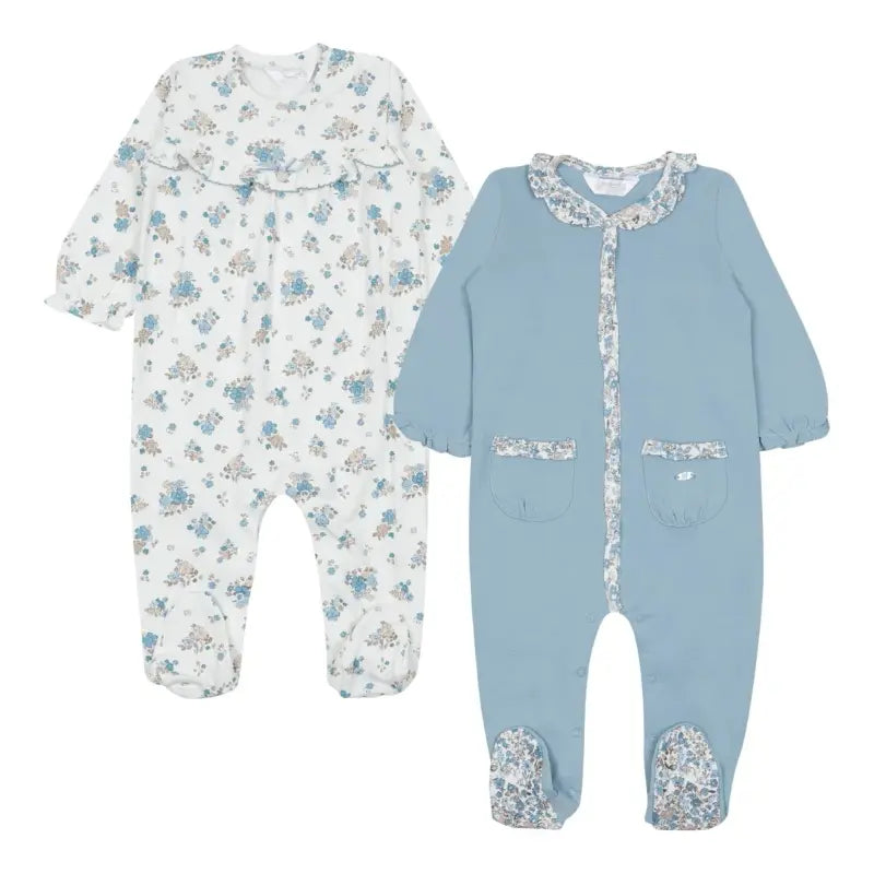 Two cotton babygrows by brand Mayoral, made in beautifully soft and comfortable brushed jersey. The blue babygrow has floral trims and cute patch pockets on the front. The ivory babygrow has a blue floral print with a blue velvet bow and logo charm, with a frill below.