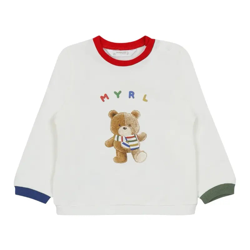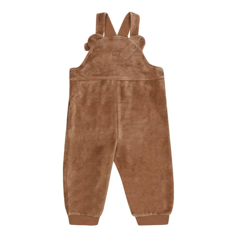 Cosy brown dungarees by Mayoral, made in soft ribbed velour with the appearance of corduroy. The bib is designed to look like a teddy bear and the adjustable shoulder straps fasten wtih buttons to form the eyes.