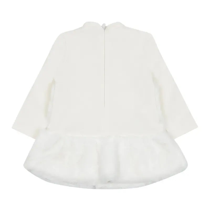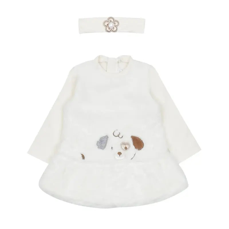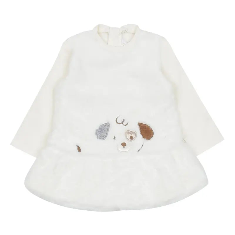 An ivory dress set by Mayoral, made in comfortable cotton jersey and cosy faux fur. Super adorable, the dress has an embroidered and appliquéd puppy dog motif in a mix of textures.
