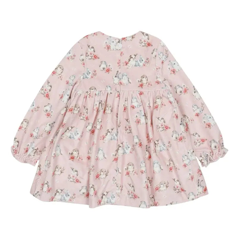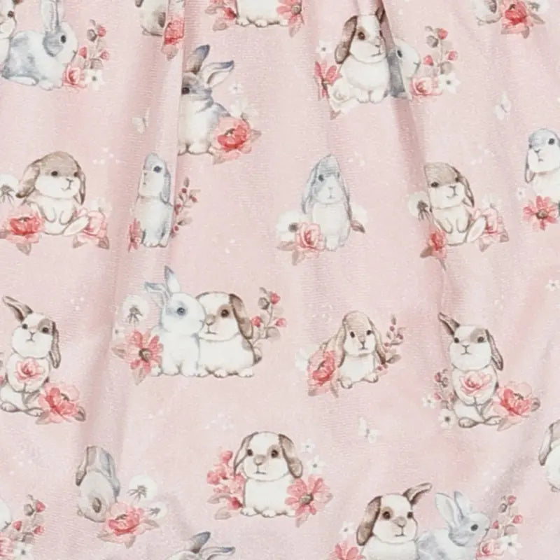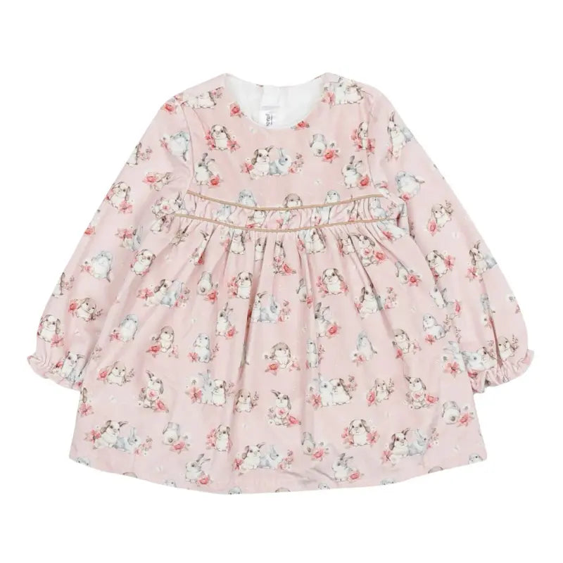 A pink dress by Mayoral, with a hidden zip on the back. The soft velvet fabric is decorated with beautiful bunny rabbits and florals. This lovely dress has a ruched detail on the bodice and a ruffled cotton lining for volume and comfort.