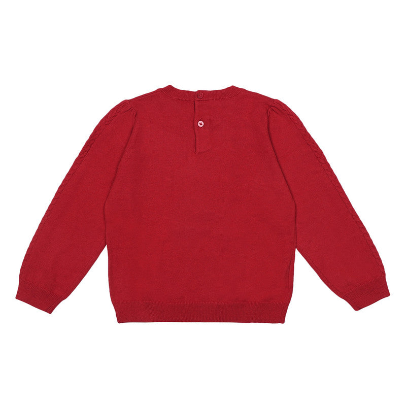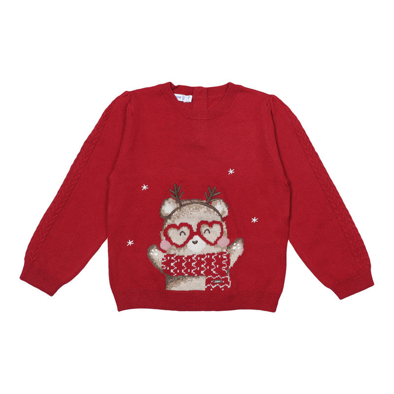 Red festive sweater for younger girls by Mayoral. This long-sleeved jumper is knitted in super-soft cotton blend, with a hint of wool for extra cosiness. Knitted within the fabric is an adorable friendly reindeer, with embroidered details. It fastens with shimmering red buttons on the back to help with dressing.