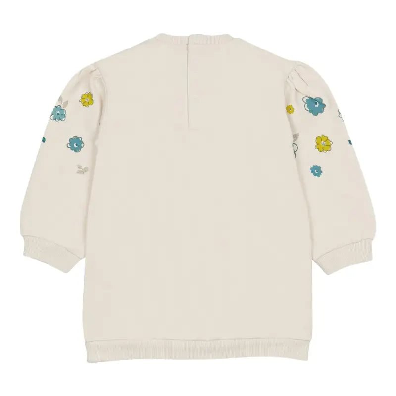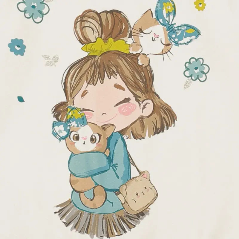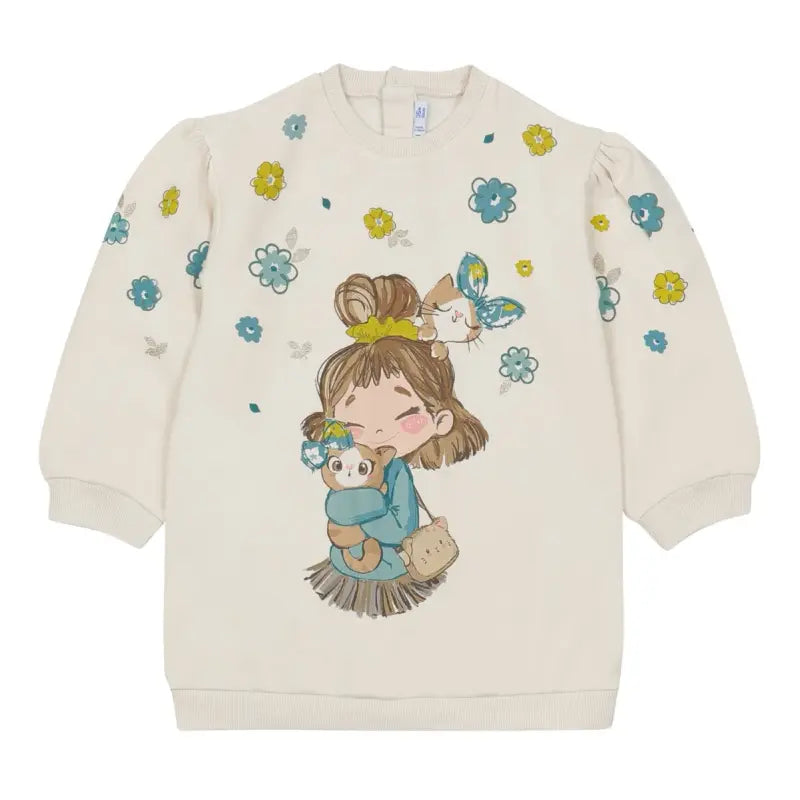A lovely ivory sweatshirt dress by Mayoral, made from a soft mid-weight cotton jersey with a fleecy interior. It is printed with a cute 'girl cuddling her cats' design on the front, surrounded with green flowers and gold glitter accents for added sparkle.