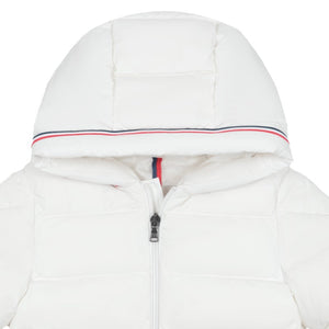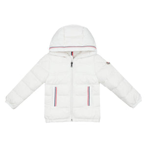 Wrap your little one in timeless style and comfort with the Moncler Enfant New Aubert Cotton-Blend Hooded Jacket. Designed in a crisp white hue, this jacket features a signature logo patch and a classic quilted design for a luxurious yet practical look. The hooded neckline and long sleeves provide extra warmth, while the zip fastening ensures easy wear. Finished with functional welt pockets, it blends fashion with everyday convenience—perfect for layering through the seasons.