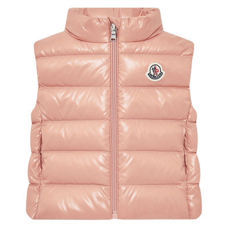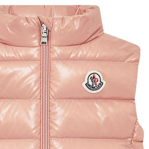 kAn iconic Moncler design reimagined for little ones, the Ghany Down Vest for Baby Girls is a versatile layer that transitions effortlessly across seasons. Presented in a soft blush pink hue, this sleeveless piece is crafted with a lightweight down-filled construction that ensures warmth without bulk. The high-neck collar and zip fastening provide a snug fit, while the signature Moncler logo patch on the chest adds a touch of heritage charm. Perfect for layering over sweaters or under jackets, the Ghany vest combines everyday practicality with timeless style.