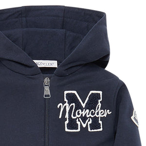 This adorable Moncler baby tracksuit in navy blue features a hooded zip-up top and coordinating jogging bottoms. The cozy cotton set is highlighted by a large, embroidered Moncler "M" logo appliqué on the chest of the hoodie. With an elasticated waistband and ribbed trims, it provides luxury comfort for everyday wear.