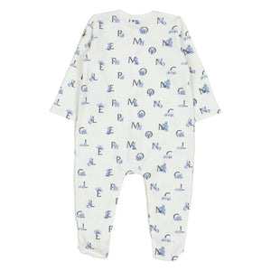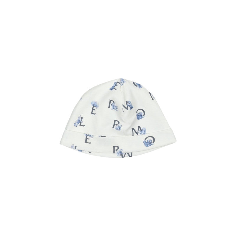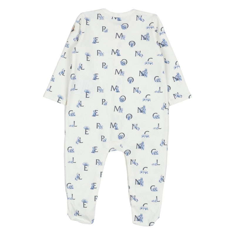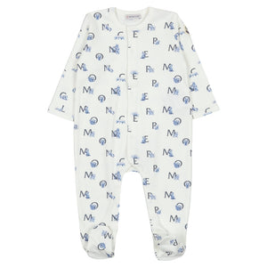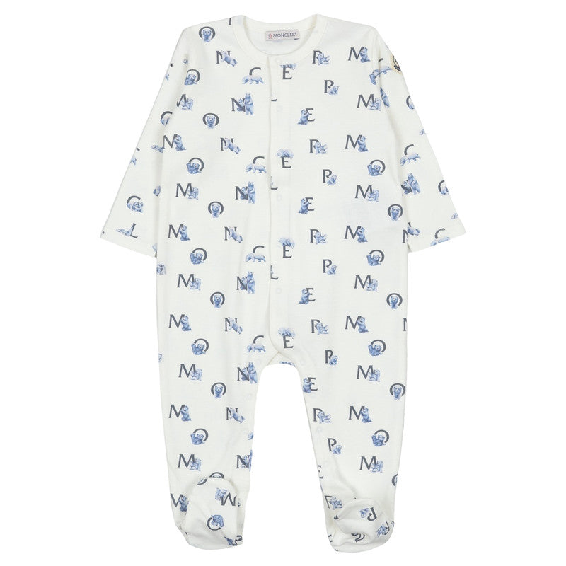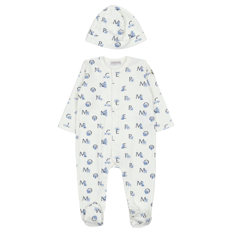 This adorable Moncler footie and hat set, featuring a stylish blue and white all-over logo and mascot print, offers supreme comfort and signature luxury for your little one.