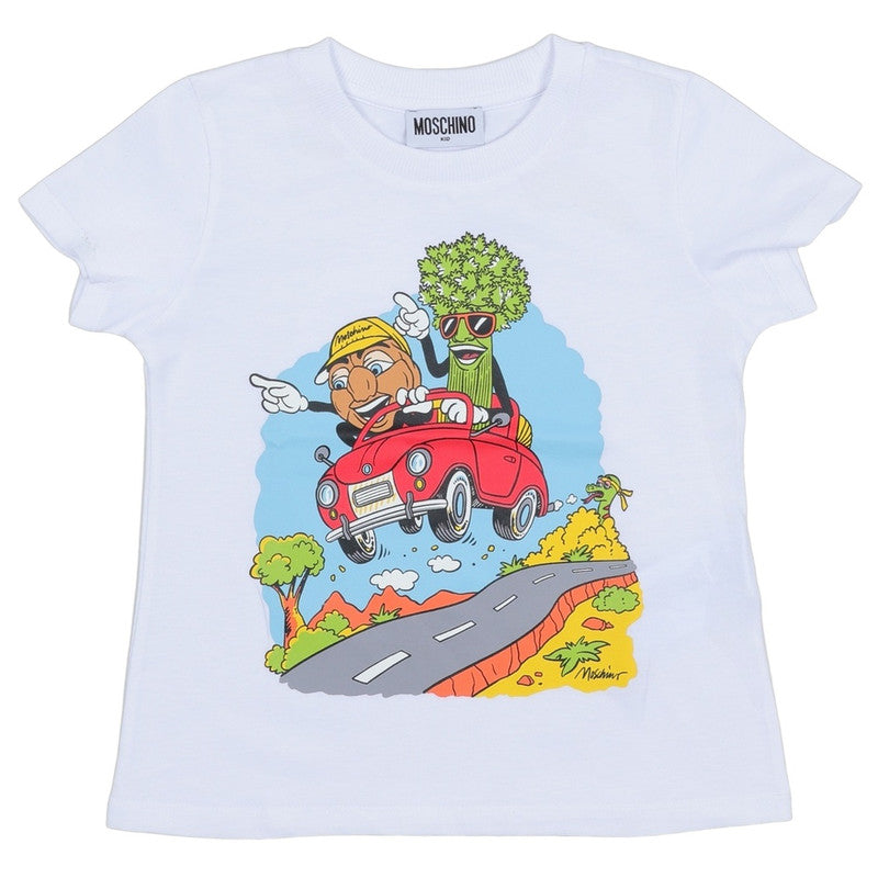 This Vibrant White T-Shirt Features A Fun Cartoon Graphic. A Character In A Red Car, Carrying A Small Tree, Drives Down A Colorful, Winding Road. The Tee Is Made Of Soft Cotton And Has A Classic Short-Sleeve Fit.