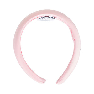 This Is A Stylish Moschino Headband In A Light Pink Color. It Features A Padded, Slightly Puffed Design. The Headband Is Adorned With The Moschino Script Logo Embroidered In Black. This Piece Is Often Part Of The Moschino Kids Or Teen Girls Accessories Collection.