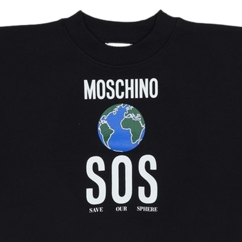 Moschino Kids Black Sweatshirt Featuring Bold Globe Graphic With “Moschino Sos” Slogan And “Save Our Sphere” Lettering. Designed With Ribbed Cuffs And Hem, Combining Everyday Comfort With A Meaningful, Eco-Conscious Style Statement.