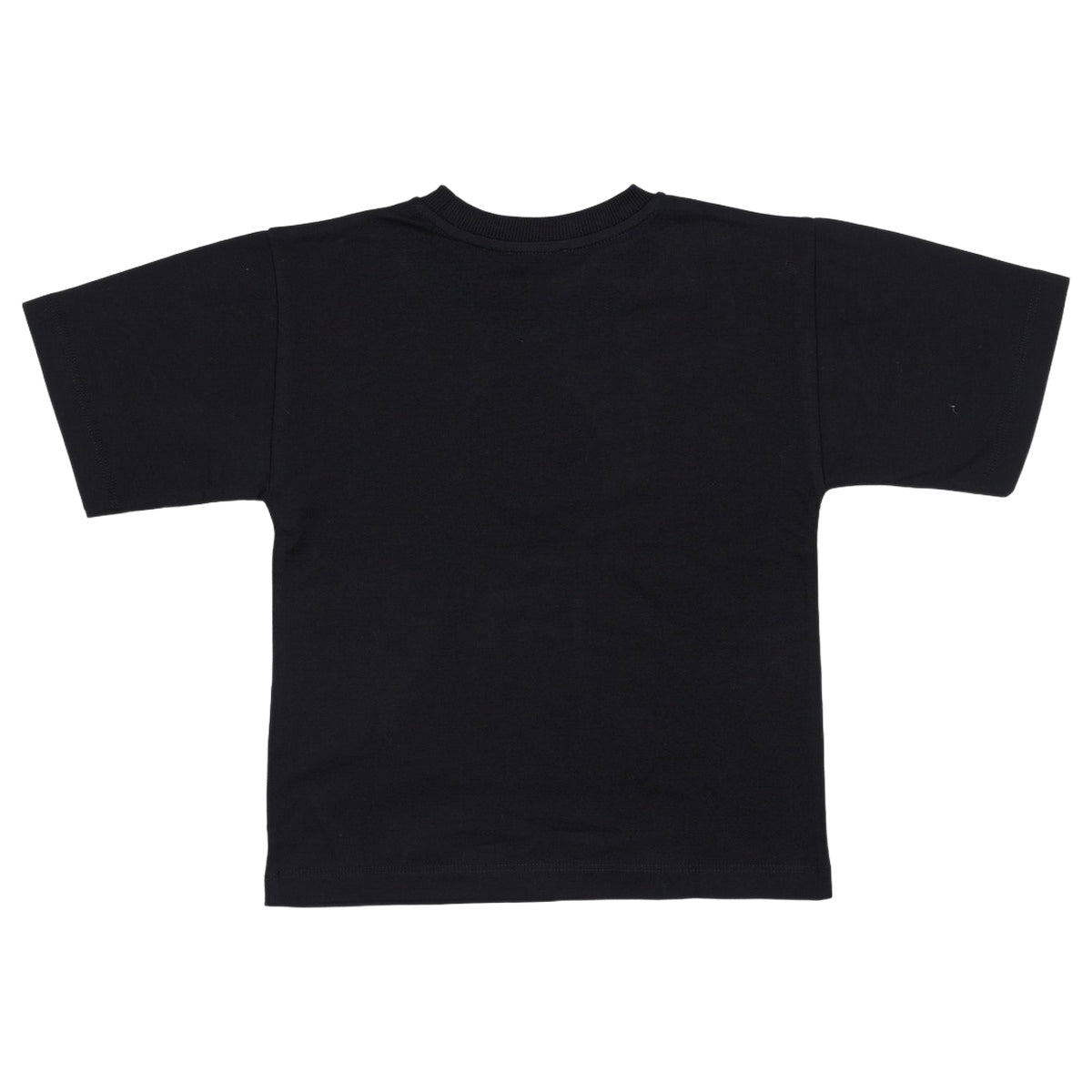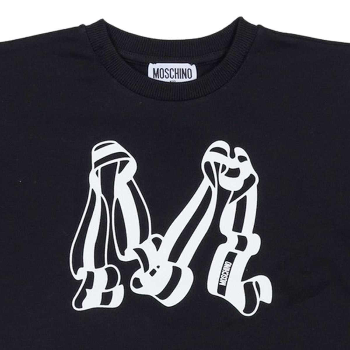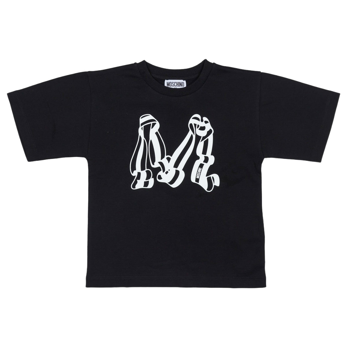 This Stylish Black T-Shirt From Moschino Is A Playful And Modern Staple For Your Child'S Wardrobe. Made From Soft, Comfortable Cotton, It Features A Unique White Ribbon Print That Forms A Large "M" On The Front. With Its Classic Crew Neck And Short Sleeves, This Top Is Perfect For Everyday Wear And Adds A Touch Of Designer Flair To Any Casual Outfit.
