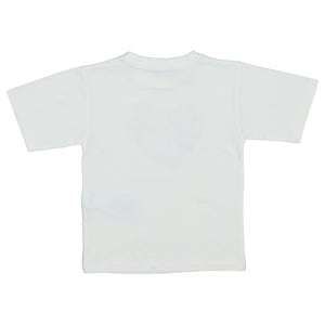 This Charming Moschino T-Shirt In Ivory Features A Playful Graphic Of Pink And Black Bows Arranged In A Heart Shape. A Sweet And Stylish Cotton Top For Kids.
