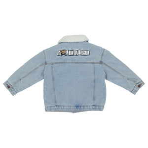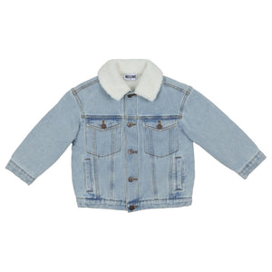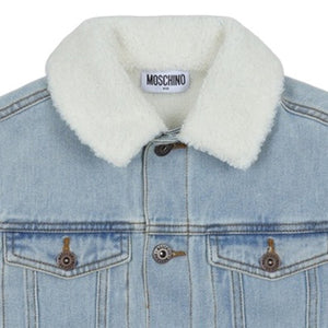 This Stylish Moschino Denim Jacket Features A Light Wash And A Cozy White Sherpa Collar, Adding Warmth And A Fashionable Vintage Look. A Cool And Durable Outer Layer.