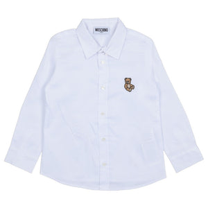This Smart White Cotton Shirt From Moschino Kids Features A Classic Collar, Button Fastening, And Is Subtly Finished With A Cute Teddy Bear Logo Appliqué On The Chest.