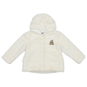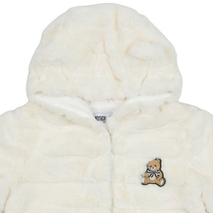This Cozy And Luxurious Cream-Colored Faux Fur Jacket From Moschino Is A Perfect Way To Keep Your Little One Warm. The Jacket Features A Soft, Plush Texture With Horizontal Seams And A Comfortable Hood. A Sweet Moschino Teddy Bear Patch On The Chest Adds A Signature Designer Touch. With A Hidden Front Closure, This Jacket Is Both A Practical And Stylish Choice For Colder Weather.