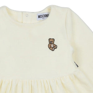 This Luxurious Ivory Moschino Baby Dress Is Made From Soft, Cozy Velvet And Features A Flared Skirt, Ribbed Cuffs, And A Small, Charming Teddy Bear Applique On The Chest.