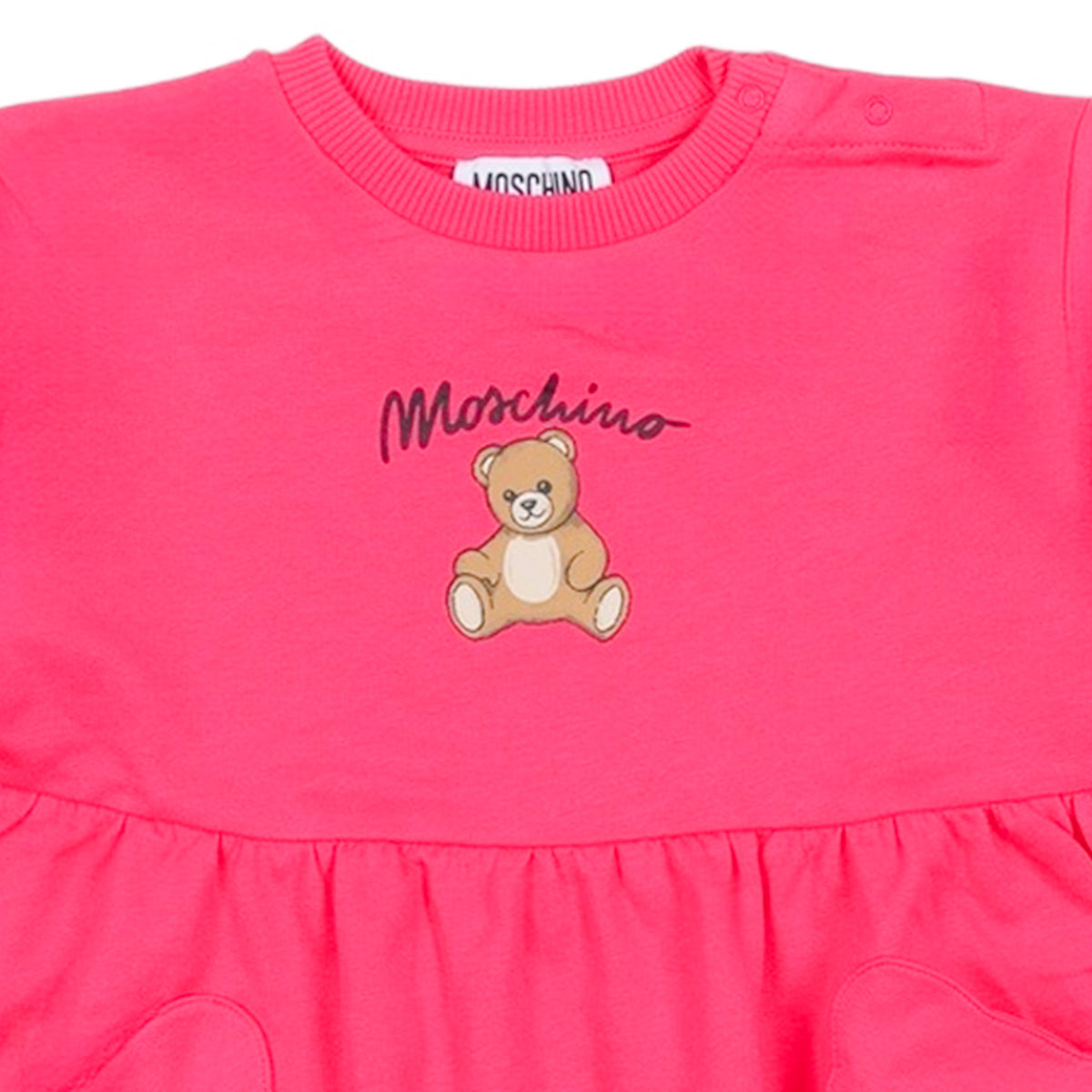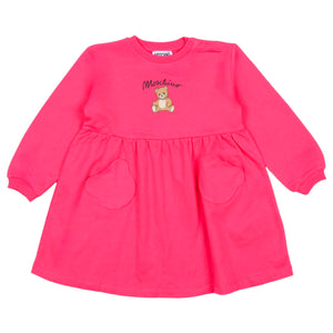 This Playful Hot Pink Dress From Moschino Is A Comfortable And Stylish Piece For Any Little One. Made From Soft Jersey Cotton, It Features A Sweet Teddy Bear Print And "Moschino" Logo On The Chest. The Dress Has Long Sleeves With Ribbed Cuffs And A Cute Drop-Waist Design With Two Adorable Heart-Shaped Pockets. A Snap-Button Closure On The Shoulder Makes For Easy Dressing. This Dress Is Perfect For Both Casual Wear And Special Occasions.