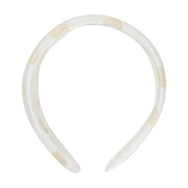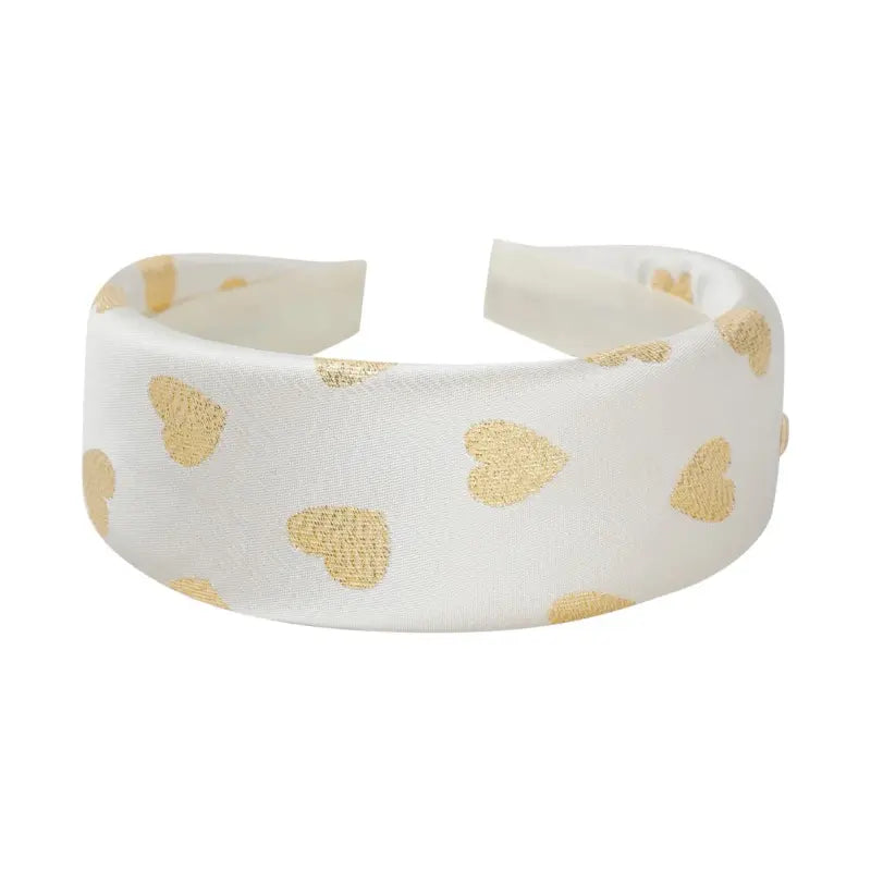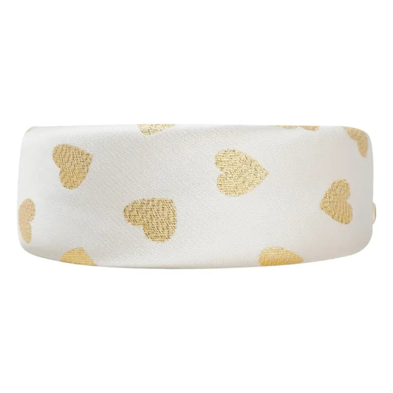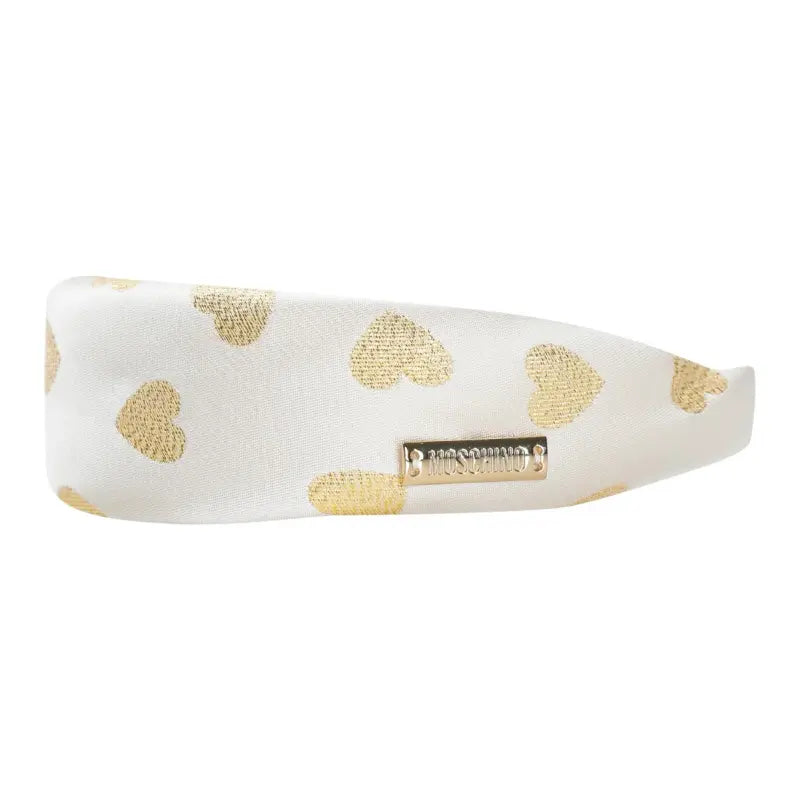 Wide Beige hairband by Italian brand Moschino Kid-Teen, made in soft satin with a gorgeous sheen. Lightly padded, with a flexible band, this lovely accessory is patterned with glittery gold hearts. It has a grosgrain trim on the inside to prevent it from slipping off.