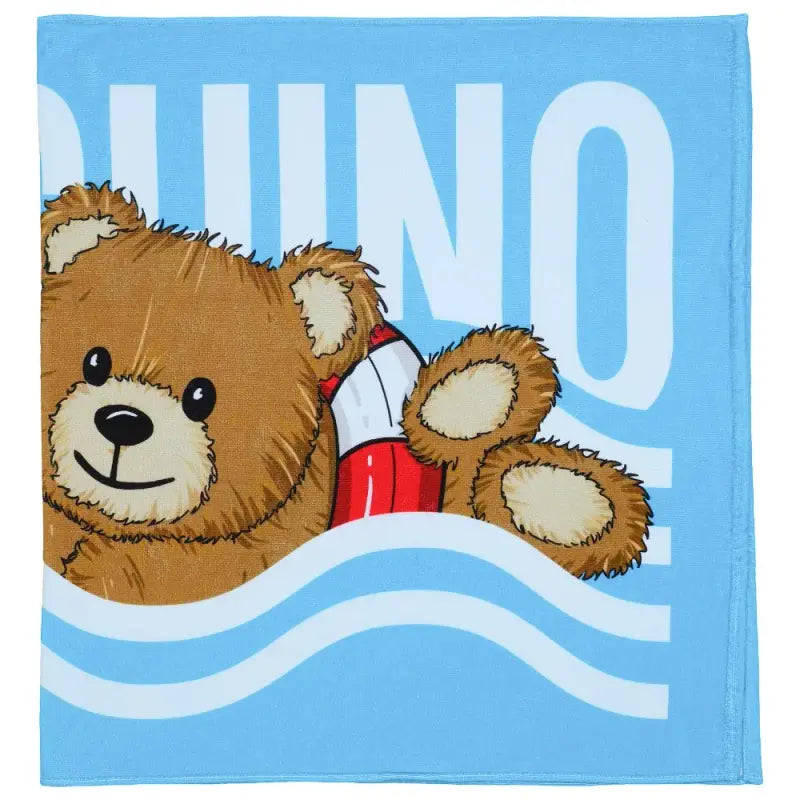 The Moschino Kids Teddy Bear-print towel in blue features a charming logo print on the front with a soft terry-cloth texture. Designed in a rectangular shape, its perfect for cozy comfort.