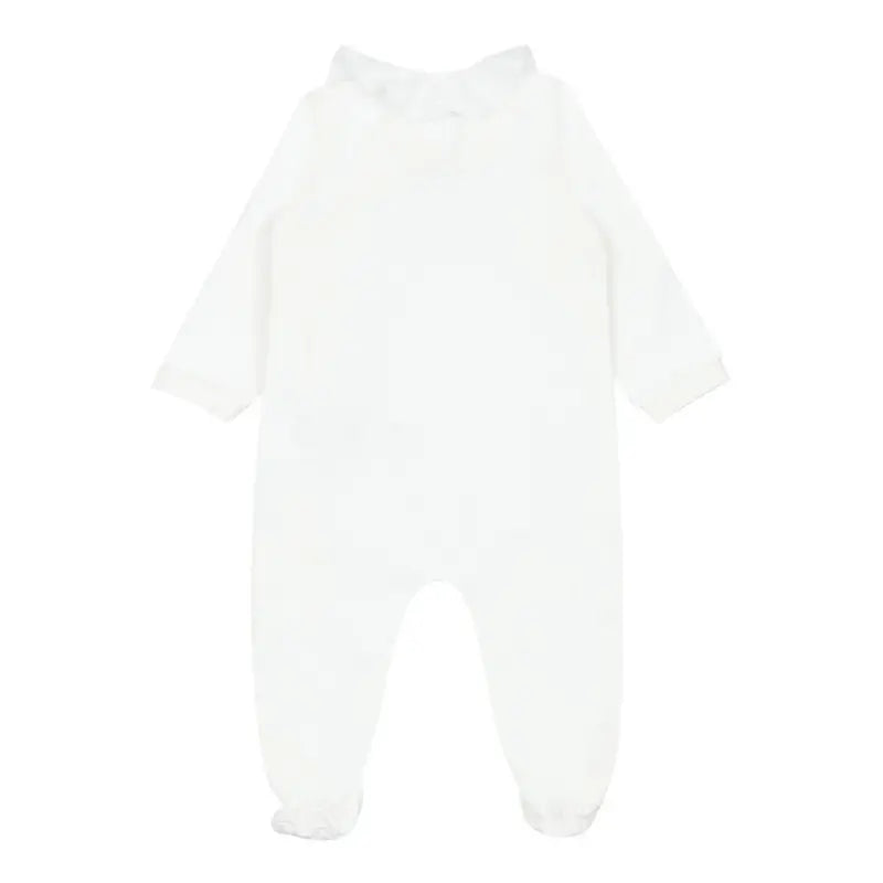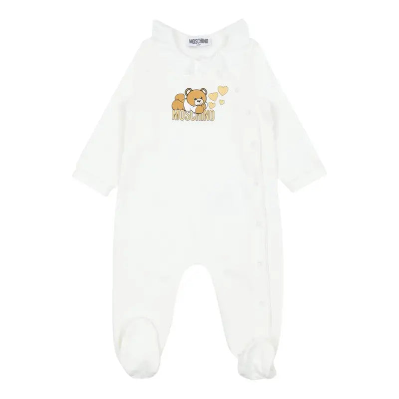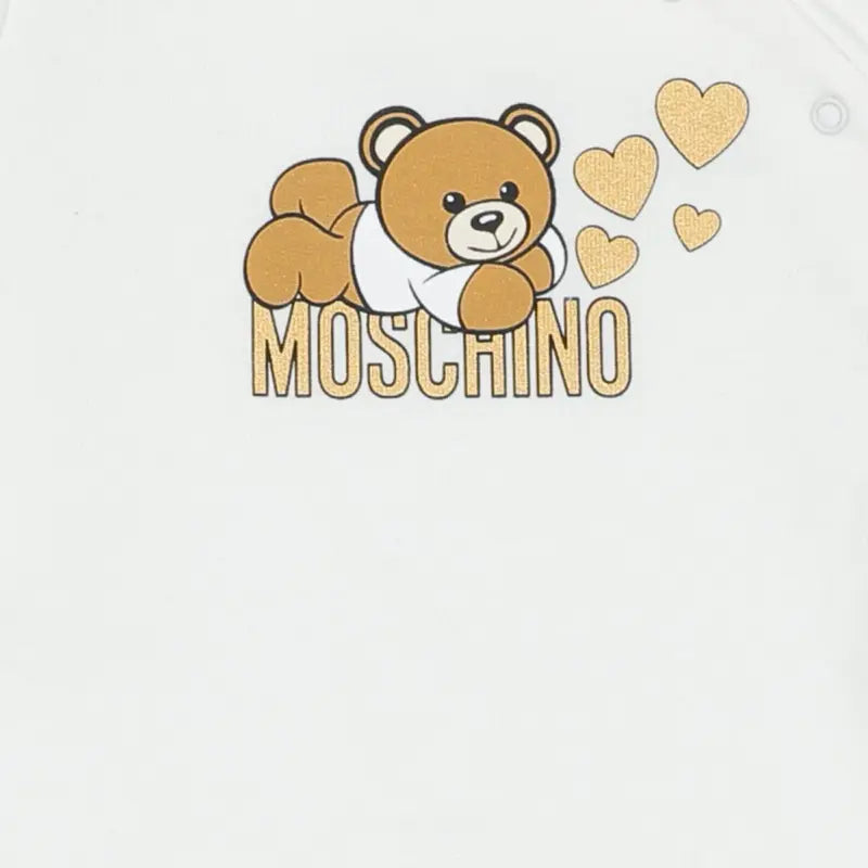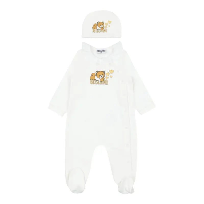 Ivory babygrow and hat set by Moschino Baby, made in soft cotton jersey. Cosy and comfortable, the babygrow has a warm, fleecy inside. It has a pretty ruffle collar and popper fastenings on the front. The brand's iconic Moschino Teddy Bear is printed on the chest in gold and white, with glittery gold hearts. The cute double layer hat has a matching logo on the front.