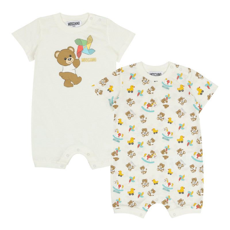 Moschino incorporate energy and a wistful elegance into their Italian designs. This baby unisex cloud toy romper set is reflective of the House's passion for sleek, enigmatic fits. One romper is crafted with a beautiful Moschino teddy graphic on the front whilst the other romper alternatively features teddy bear, duck and rocking horse patterning all-over. Made in the softest high quality, they will be obsessed.