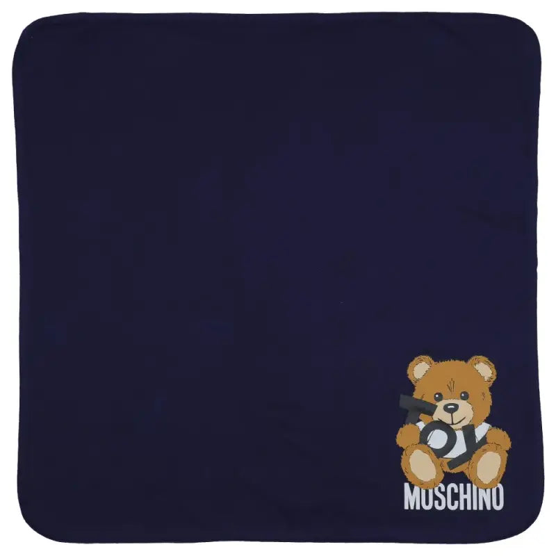 The Moschino Kids logo-print blanket in navy blue features a sleek square shape with a subtle logo tag. Soft and cozy, it’s perfect for keeping little ones warm in style.