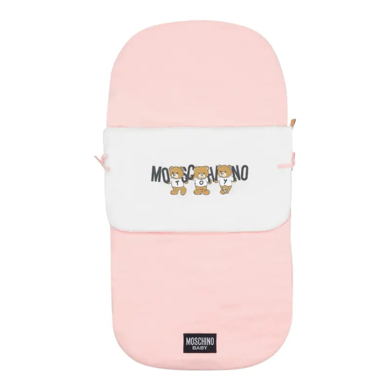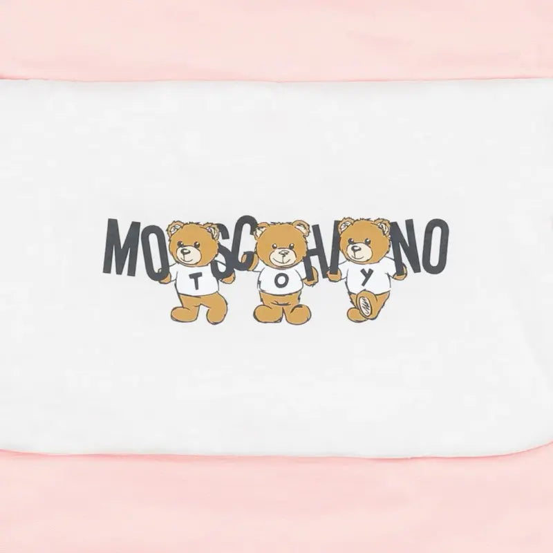 Pink nest by Moschino Baby, made from cotton jersey for a soft and snuggly feel. Soothing for baby, this padded nest is printed with bold logo lettering and three Moschino Teddy Bear characters. It fastens with a zip down one side and along the base.