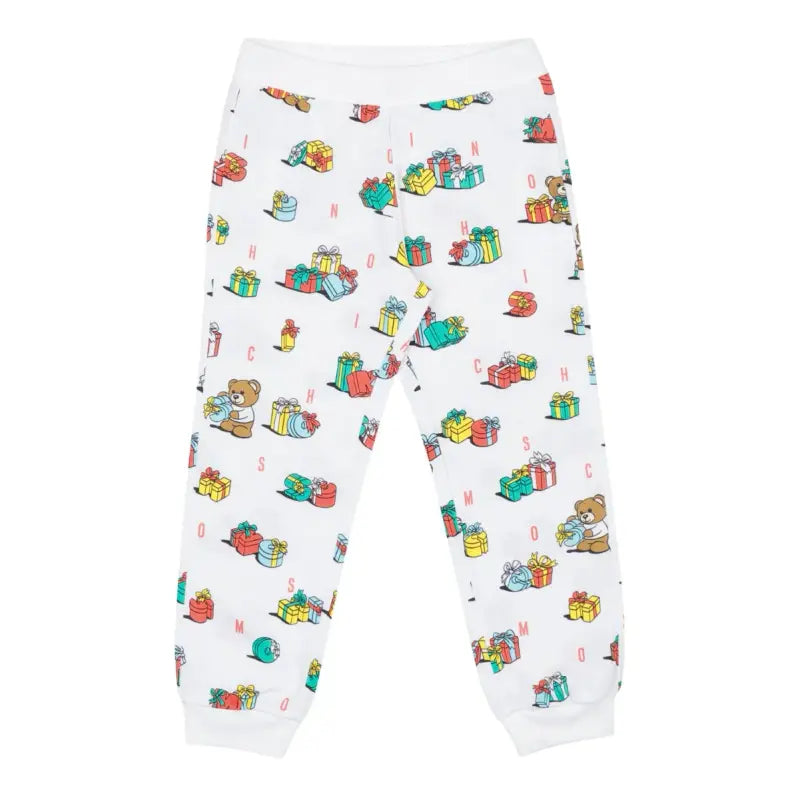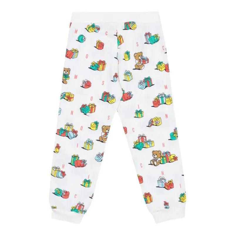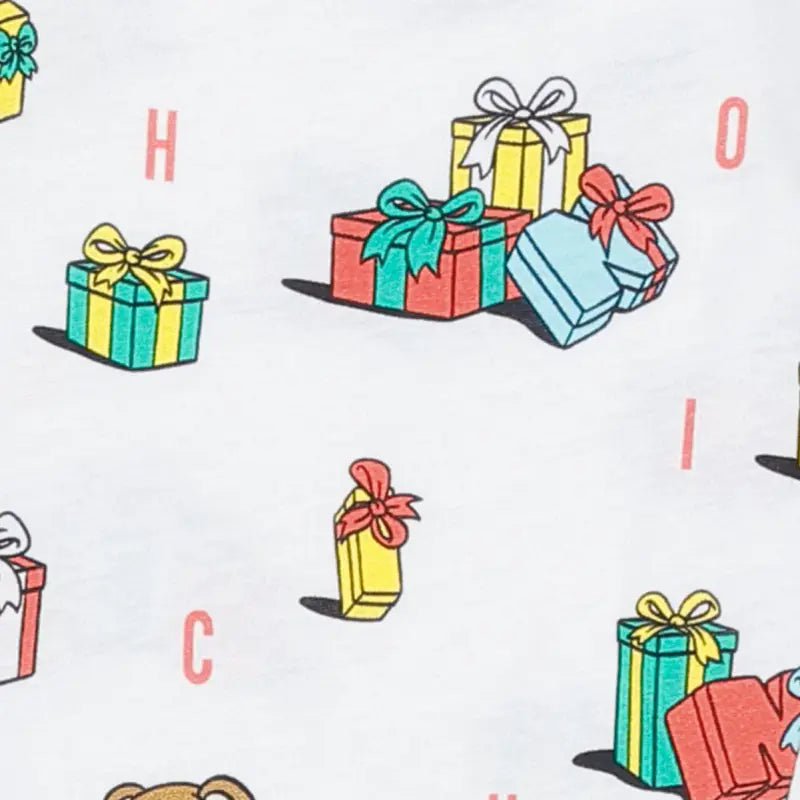 Moschino Teddy Bear with gifts print on the Long-sleeved t-shirt with Shoulder snap button closure. Leggings with allover print and elastic waist