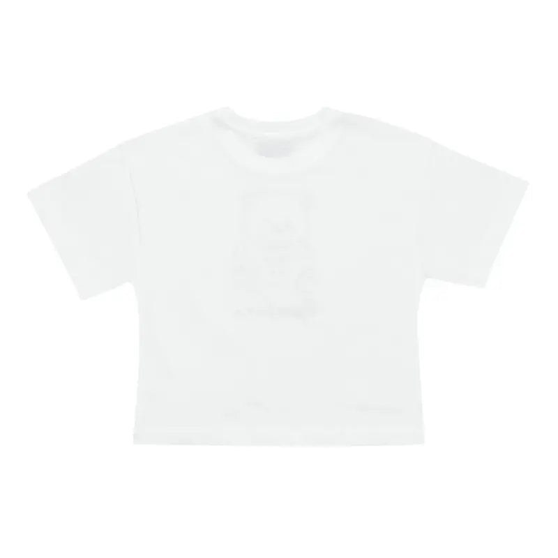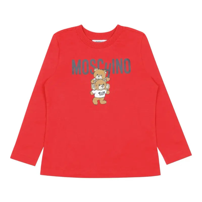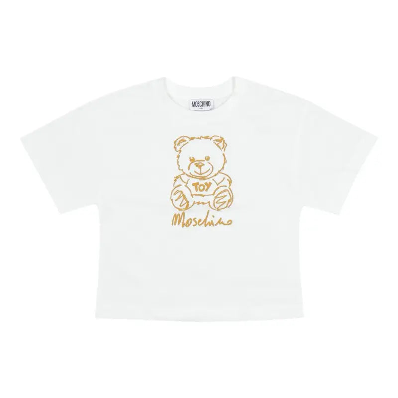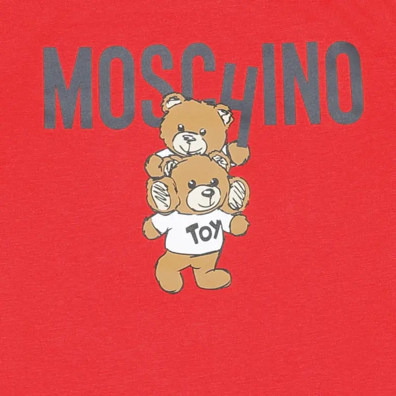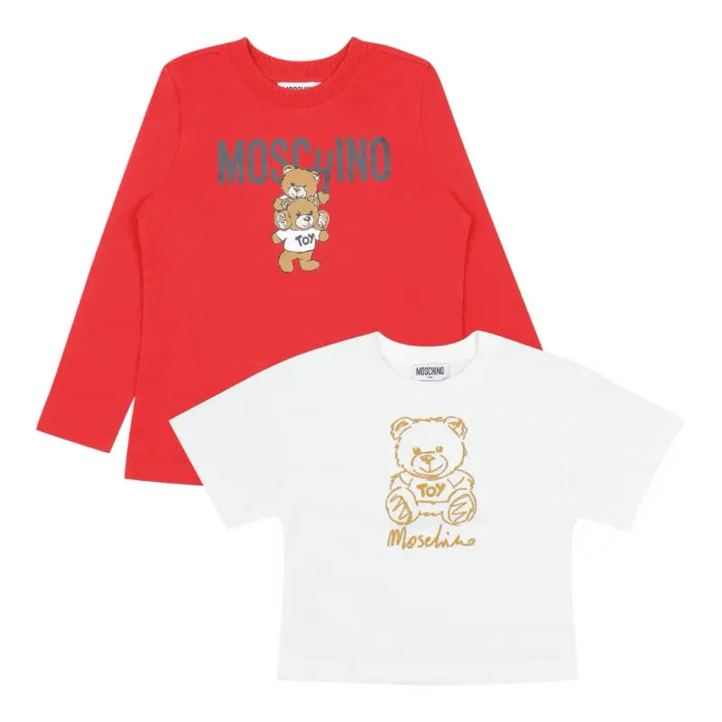 The Moschino Kids Teddy Bear-print T-shirt set includes two shirts in white and bright red, made from cotton with a jersey texture. Each shirt features the signature Teddy Bear motif, a crew neck, and a logo print on the front, with a straight hem. The set comes in a gift box for a special presentation.