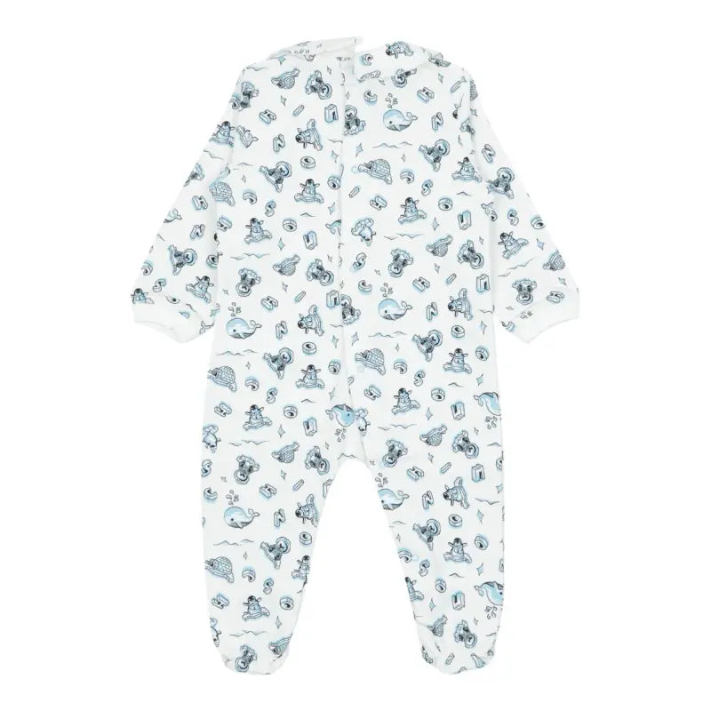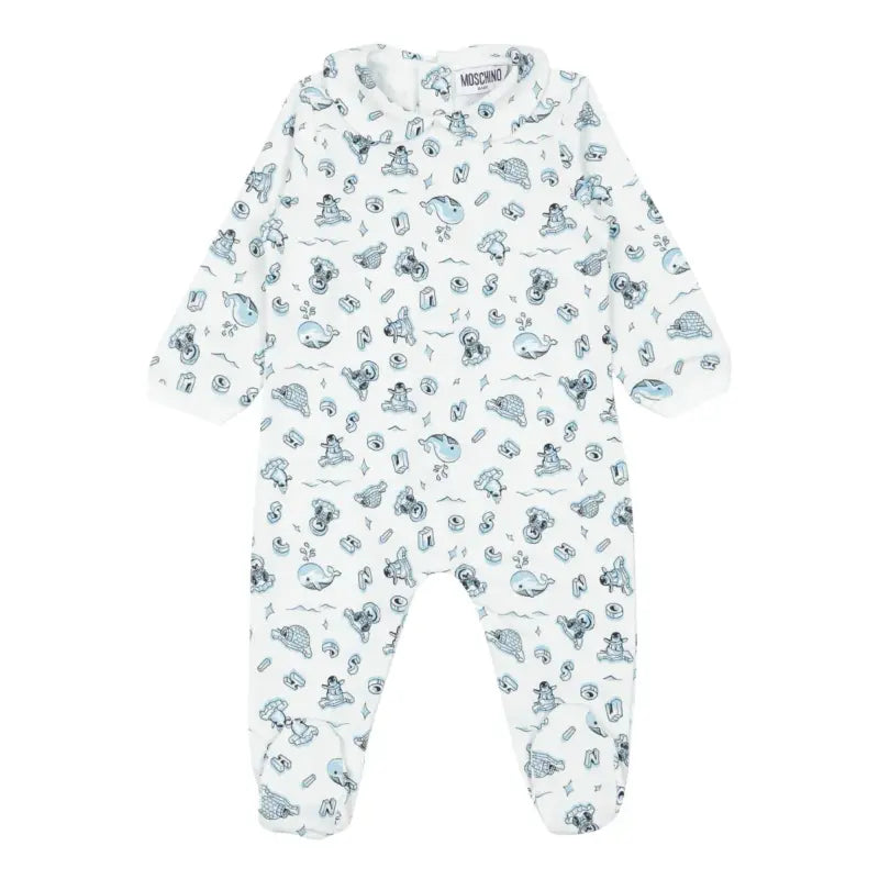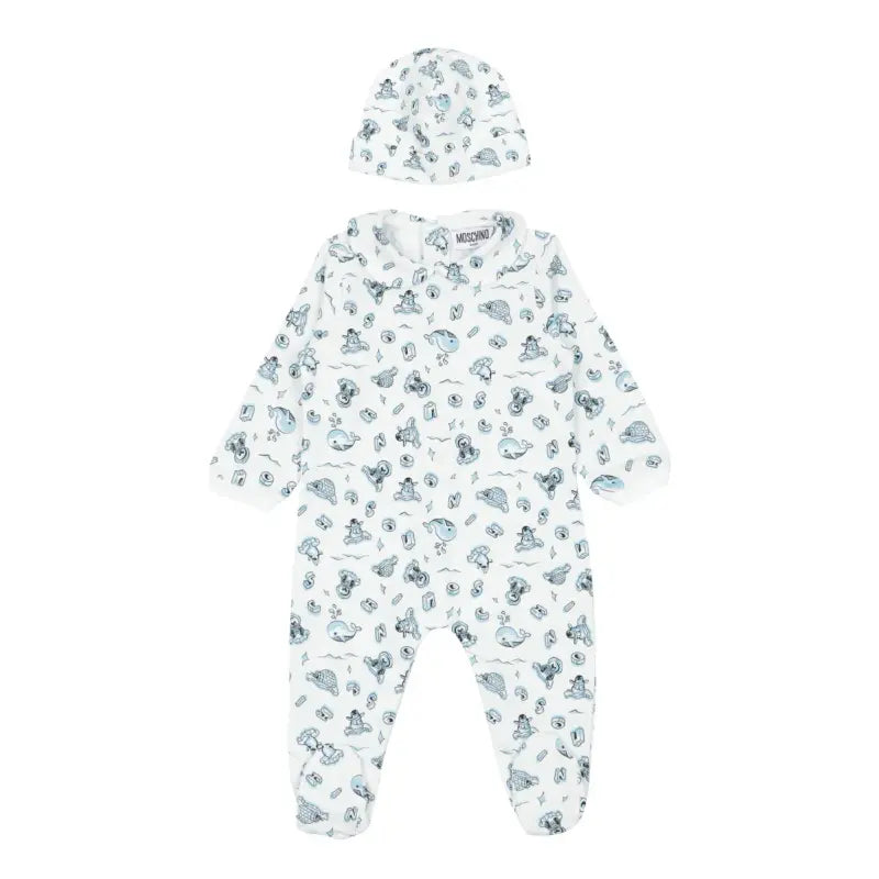 Indulge the newest member of your family with Moschino's exquisite 2-piece set. Crafted from premium cotton, this matching pyjama onesie and beanie offer unparalleled comfort and style. The convenient back button fastening and beautiful gift box.