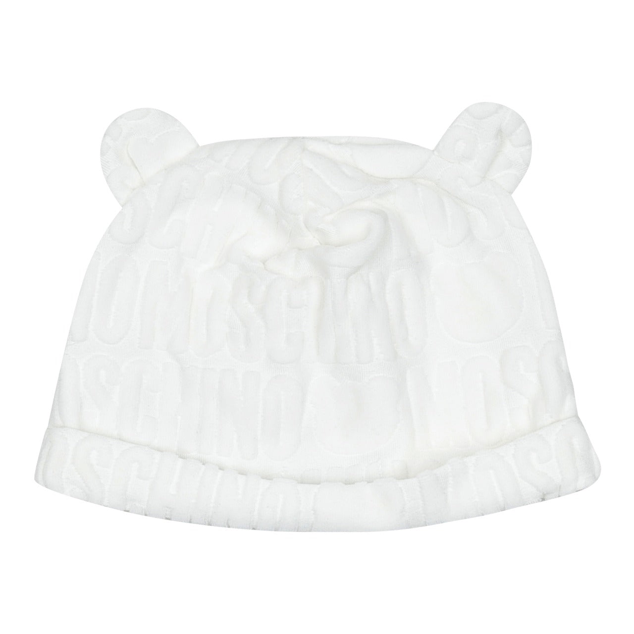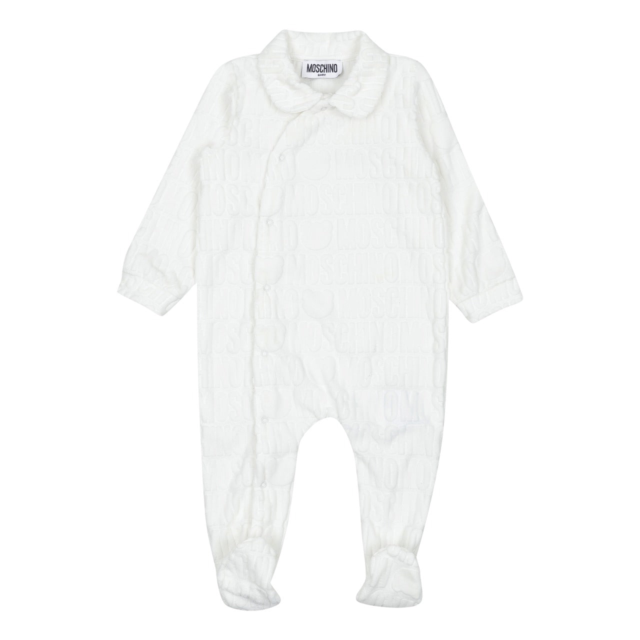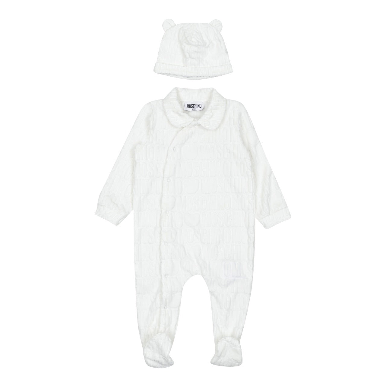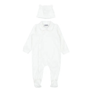 The Moschino Kids logo-jacquard terry-cloth footie in white is made from a soft cotton blend with a terry-cloth effect. It features a jacquard logo motif, a Peter Pan collar, long sleeves, and an off-center front fastening. The set is completed with a matching beanie for a coordinated look.