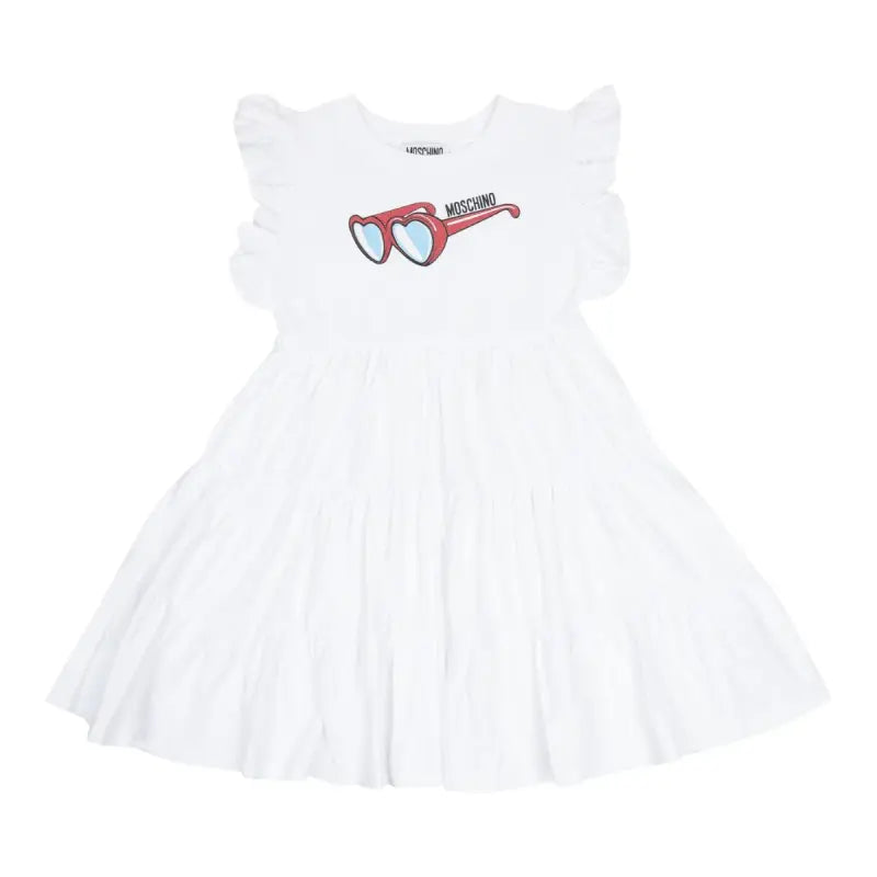 This girls t-shirt dress is reflective of the House's passion for sleek, opulent designs. Crafted in beautiful tiered ruffles on the hem and trim, complete with a statement pink pair of Moschino sunglasses graphic.