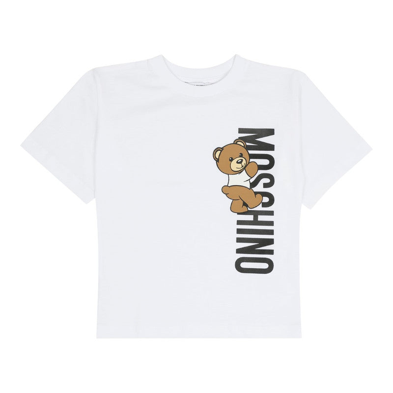 White teddy bear logo t-shirt for boys and girls by Moschino. Made from soft cotton jersey. Features the brands iconic teddy bear and logo on the front and it has ribbed neckline.