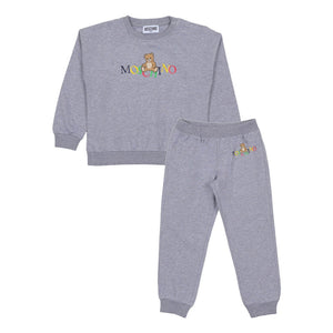 This Comfortable Grey Moschino Younger Tracksuit Features A Sweatshirt With A Colourful Moschino Logo And Teddy Bear Print, Matched With Soft Joggers Featuring The Same Motif On The Back Pocket.