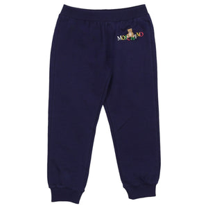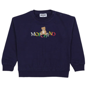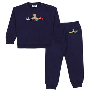 Dress Them In Style With This Navy Blue Moschino Younger Tracksuit. It Features A Soft Sweatshirt With A Vibrant Multi-Coloured Logo And Teddy Bear Print, Matched With Joggers Featuring The Same Motif On The Thigh.