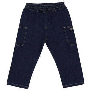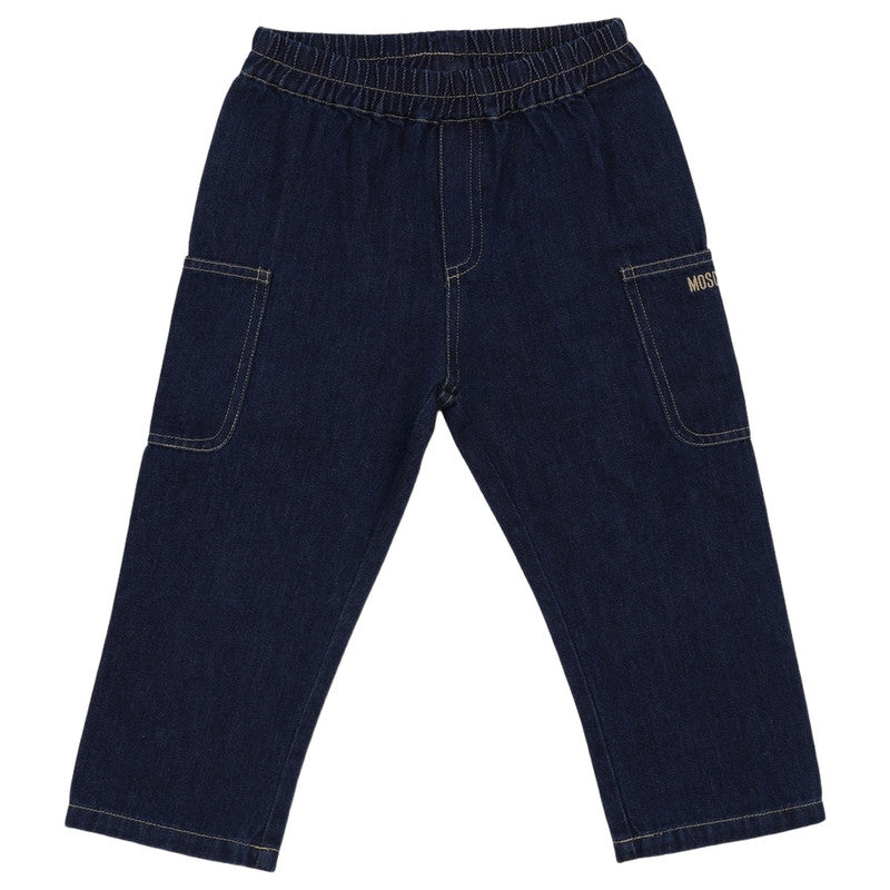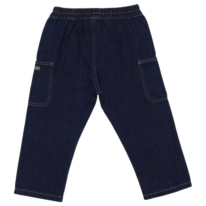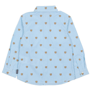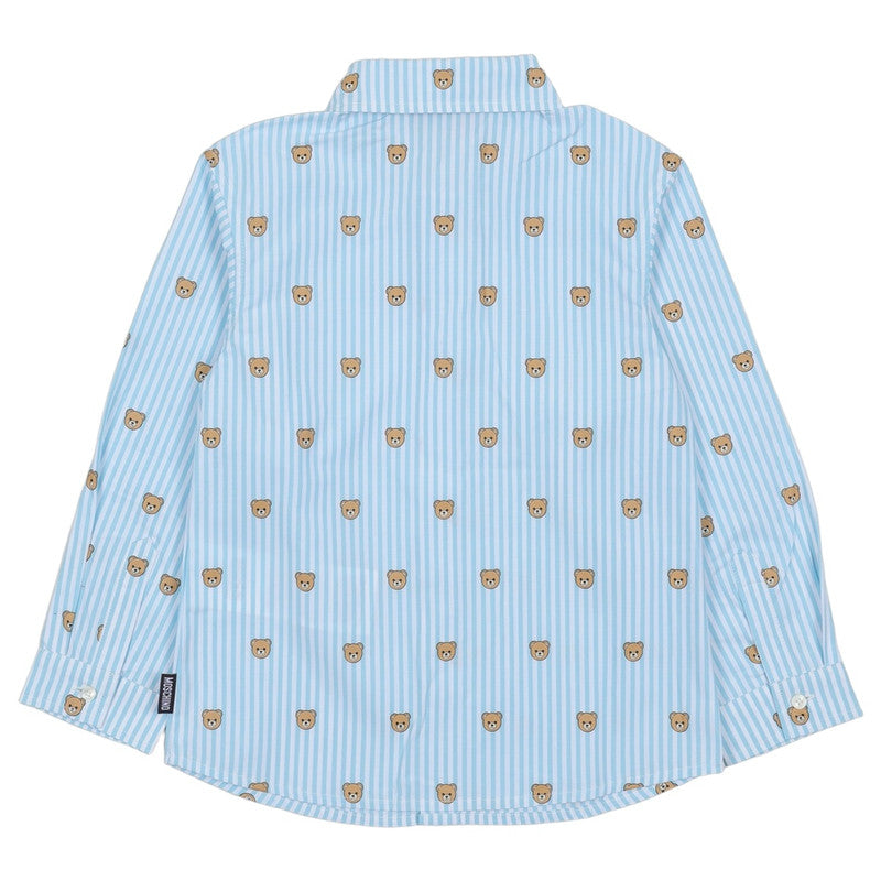 The Long-Sleeve Button-Down Shirt Is Light Blue With White Vertical Stripes. It'S Adorned With An All-Over Print Of The Brand'S Iconic Teddy Bear Mascot. The Trousers Are A Dark Denim Blue With A Comfortable Elastic Waistband. They Have Side Pockets And A Subtle Moschino Logo Embroidered On One Of The Legs. This Set Combines A Playful Top With A Classic, Versatile Pair Of Trousers.