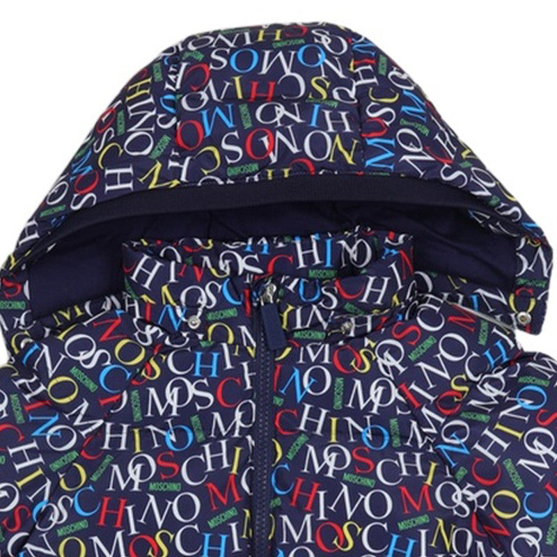 This Stylish Navy Blue Puffer Jacket From Moschino Is A Playful And Warm Choice For Cooler Weather. It Features A Bold, All-Over Print Of The Moschino Logo In Various Vibrant Colors, Making It A Standout Piece. The Jacket Includes A Comfortable Hood, A Full-Zip Front, And Elasticated Cuffs To Keep The Cold Out. Padded For Warmth And Lightweight For Ease Of Movement, It'S Perfect For Keeping Your Little One Cozy On Any Adventure.