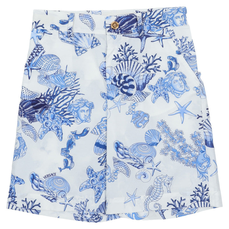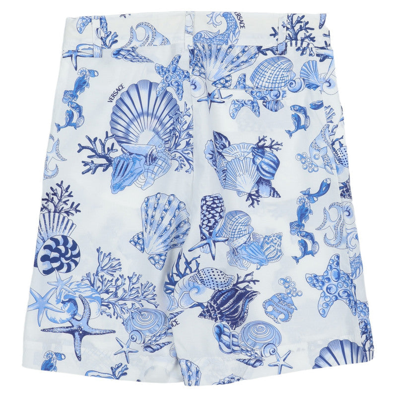 White shorts by luxury Italian brand Versace, made in soft, smooth cotton poplin. They feature the designer's Coral Theatre print in blue incorporating corals, seashells and starfish motifs, with subtle navy blue logos.