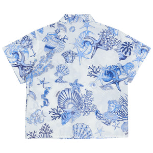White shirt by luxury Italian brand Versace, made in soft, smooth cotton poplin. This short-sleeved shirt features the designer's Coral Theatre print in blue incorporating corals, seashells and starfish motifs. It has a subtle navy blue logo on the front and fastens with buttons, with a gold-tone Medusa button at the neck.
